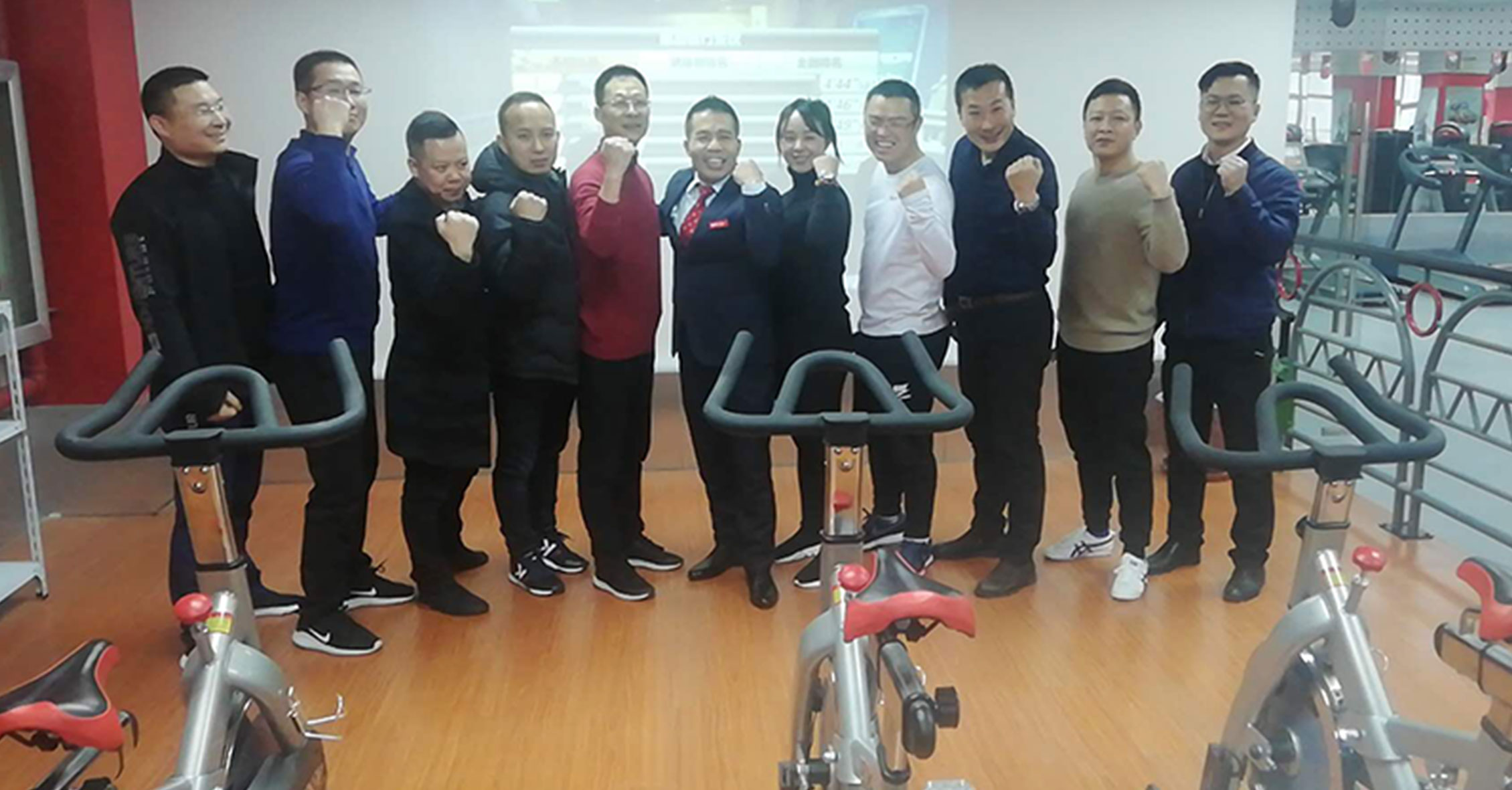 在展厅,我司组织了一场单车竞赛,经销商们踊跃参与。最新开发的单车竞赛系统给单车竞赛增添了许多新的趣味。比赛过程中大家高喊助威,最终前三名都获得动感单车奖励!